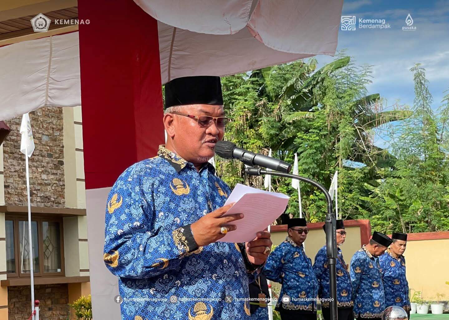 Kepala Kantor Kementerian Agama Kabupaten Wajo, H. Muhammad Subhan, bertindak sebagai pembina upacara dan membacakan sambutan seragam Menteri Pemuda dan Olahraga Republik Indonesia.